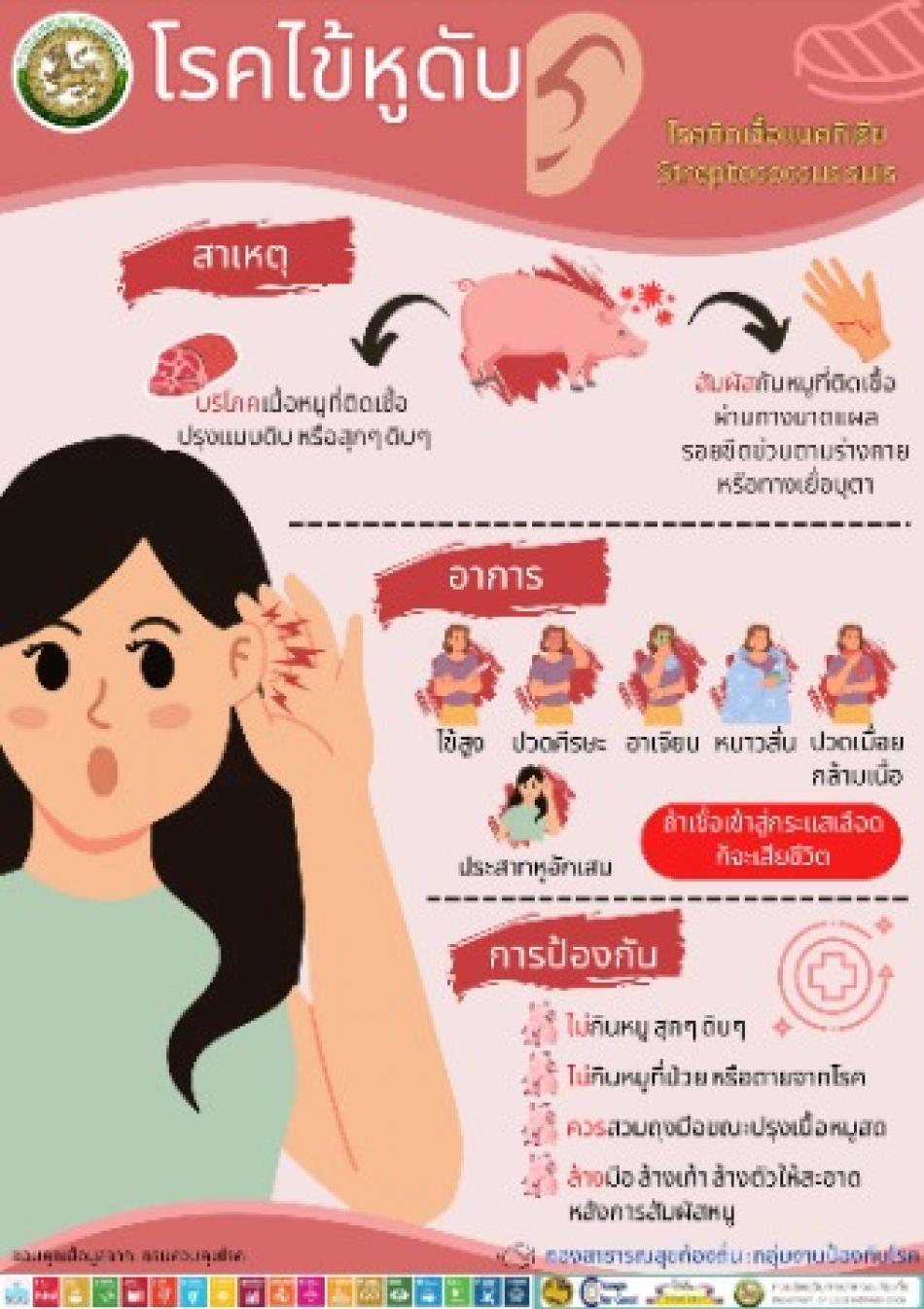 ประชาสัมพันธ์ เรื่อง โรคไข้หูดับ โรคไข้หูดับ เกิดจากเชื้อแบคทีเรียสเตร็พโตค็อกคัส ซูอิส (Streptococcus suis) โดยเชื้อนี้พบในทางเดินหายใจ และในเลือดของหมูที่กำลังป่วย สาเหตุของโรคไข้หูดับ -... [6 เมษายน 2567]