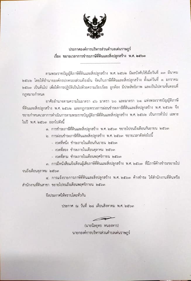 ชื่อเรื่อง : ขยายเวลาการชำระภาษีที่ดินและสิ่งปลูกสร้าง