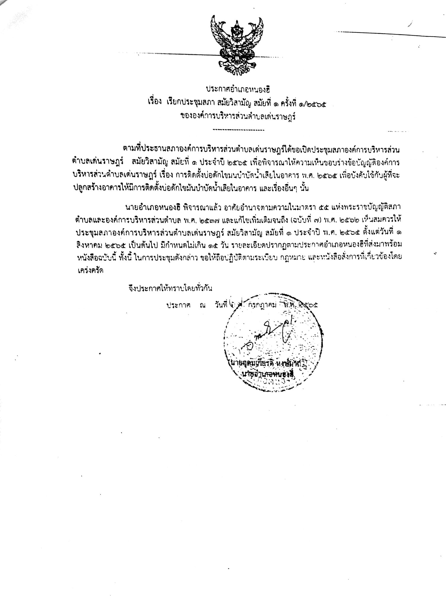 เรื่อง เรียกประชุมสภา สมัยสามัญ สมัยที่ 1 ครั้งที่ 1/2565 ขององค์การบริหารส่วนตำบลเด่นราษฎร์