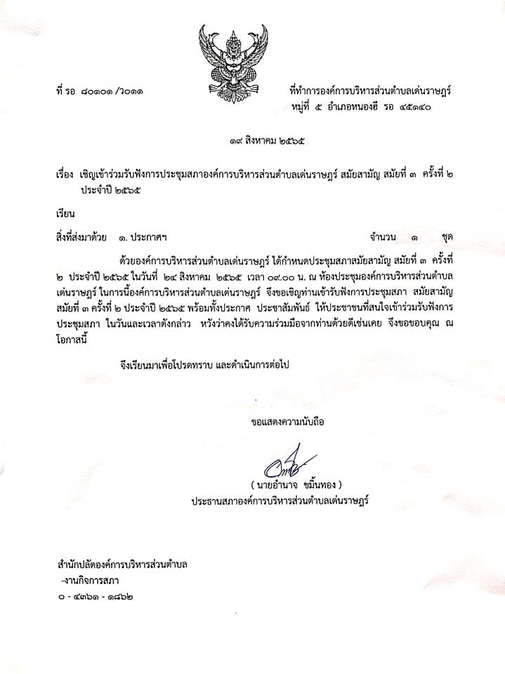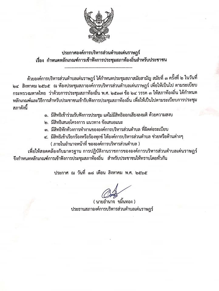 เรื่อง เชิญเข้าร่วมรับฟังการประชุมสภาองค์การบริหารส่วนตำบลเด่นราษฎร์ สมัยสามัญ สมัยที่ 3 ครั้งที่ 2 ประจำปี 2565 / เรื่อง กำหนดหลักเกณฑ์การเข้าฟังกา