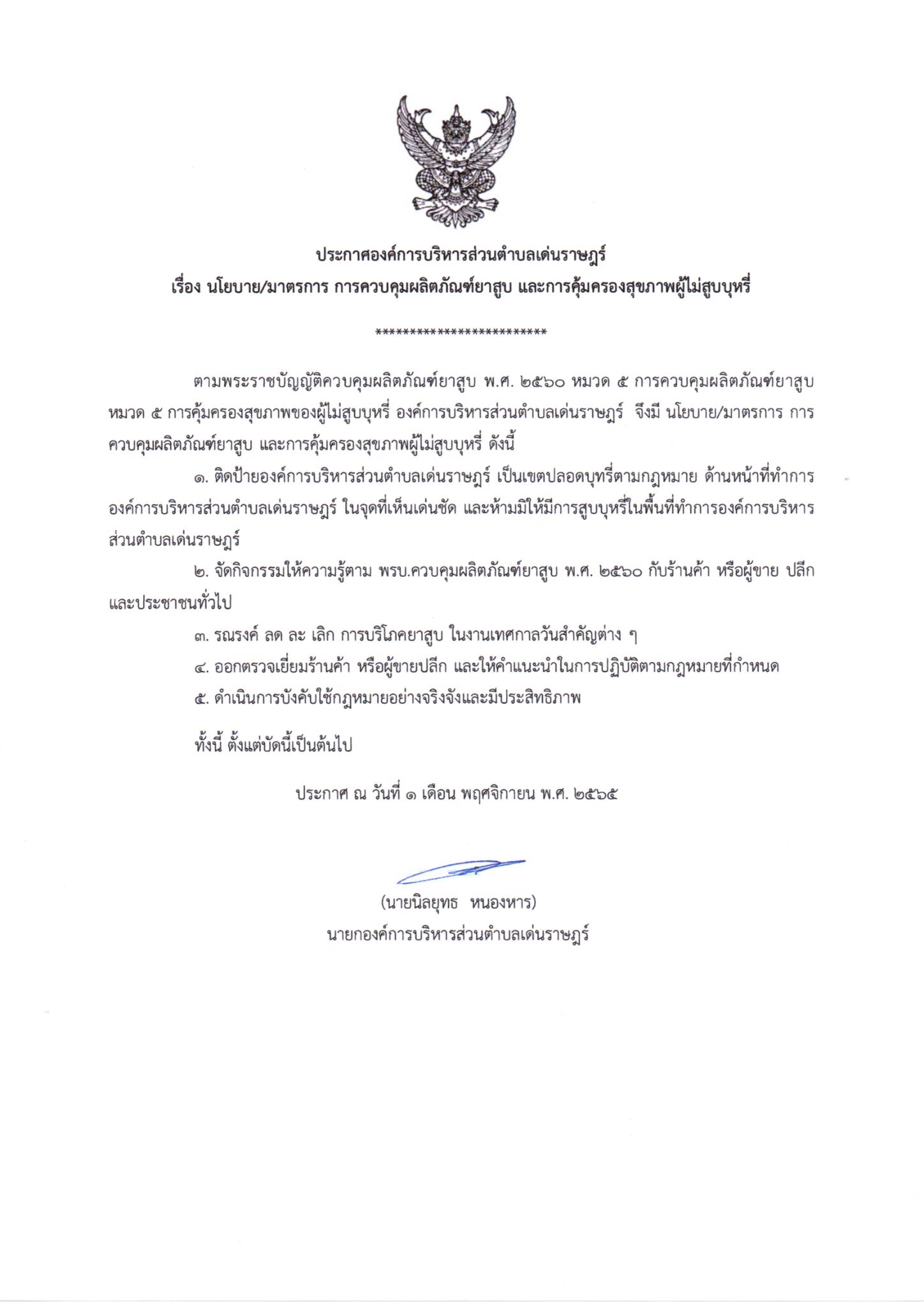 ประกาศ องค์การบริหารส่วนตำบลเด่นราษฎร์ เรื่อง นโยบาย/มาตรการ การควบคุมผลิตภัณฑ์ยาสูบ และการคุ้มครองสุขภาพผู้ไม่สูบบุหรี่