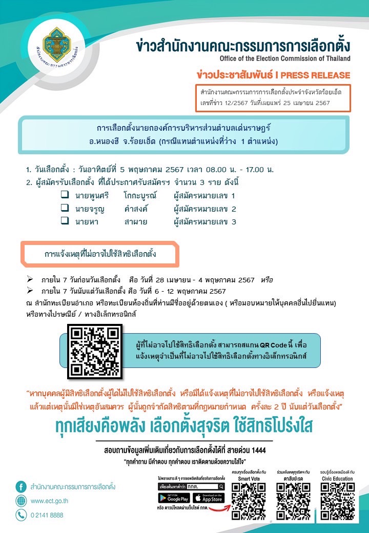 ชื่อเรื่อง : ประชาสัมพันธ์ การเลือกตั้งท้องถิ่นจังหวัดร้อยเอ็ด (กรณีแทนตำแหน่งที่ว่าง) ที่จะมีการเลือกตั้งในวันอาทิตย์ที่ 5 พฤษภาคม 2567