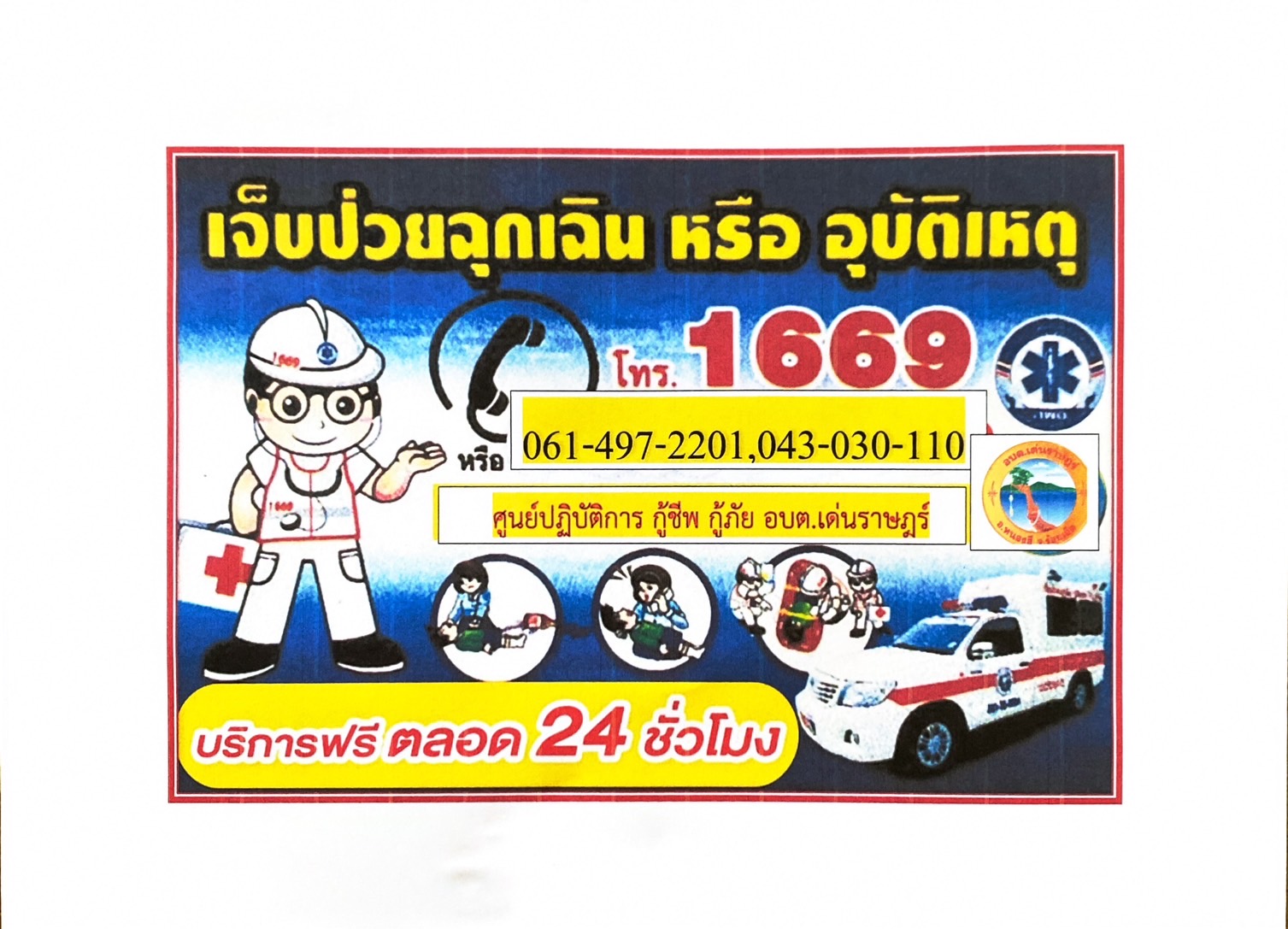 องค์การบริหารส่วนตำบลเด่นราษฎร์ ขอแจ้งประชาสัมพันธ์หมายเลขโทรศัพท์ หน่วยบริการการแพทย์ฉุกเฉิน (หน่วยกู้ชีพ) ตำบลเด่นราษฎร์ ดังนี้