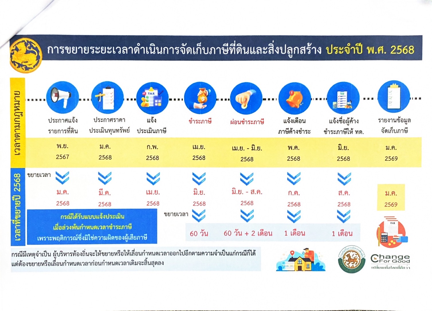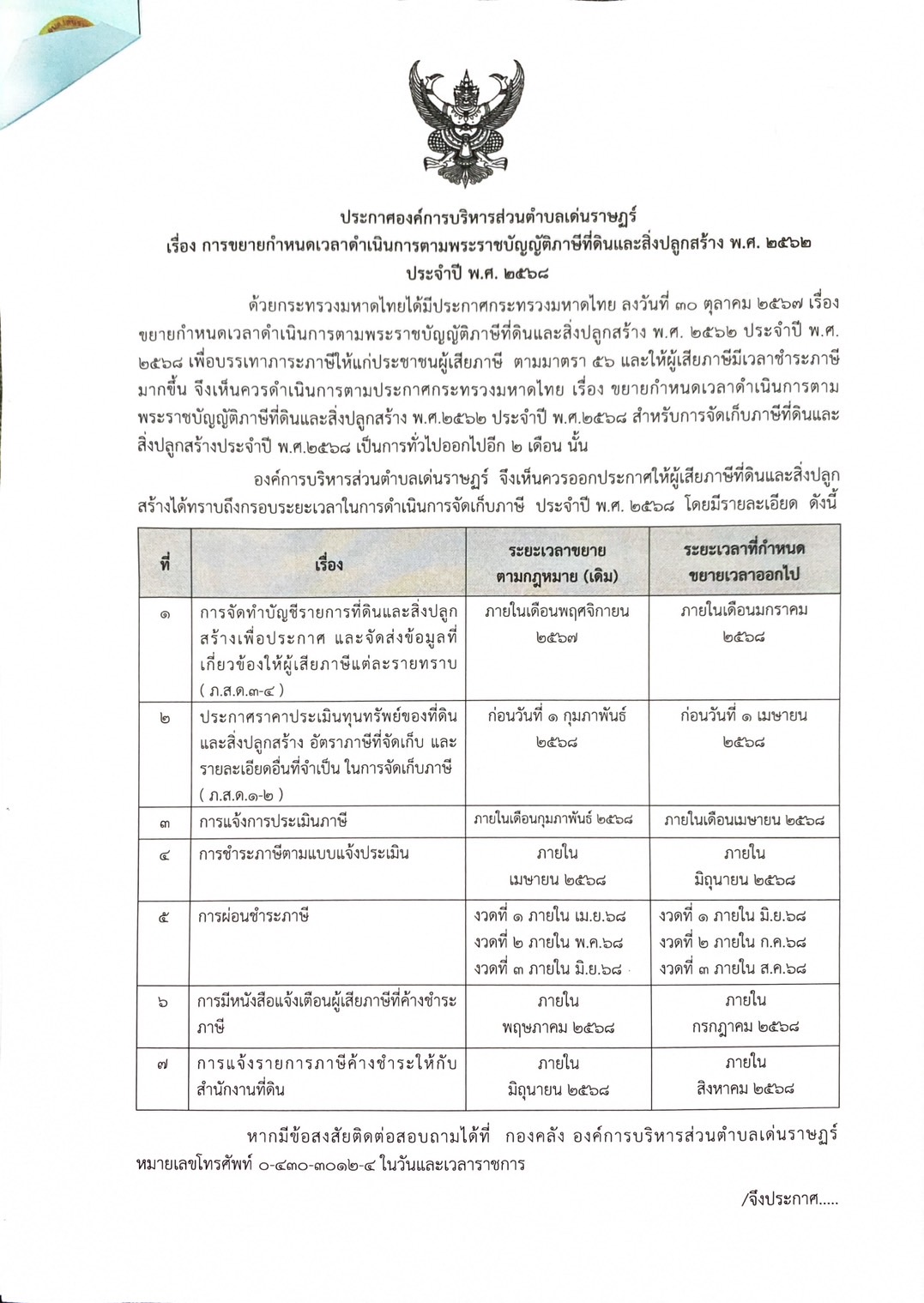 #แจ้งข่าว#ประชาสัมพันธ์ เรื่อง การขยายกำหนดเวลาดำเนินการตามพระราชบัญญัติภาษีที่ดินและสิ่งปลูกสร้าง พ.ศ.2562 ประจำปี พ.ศ. 2568