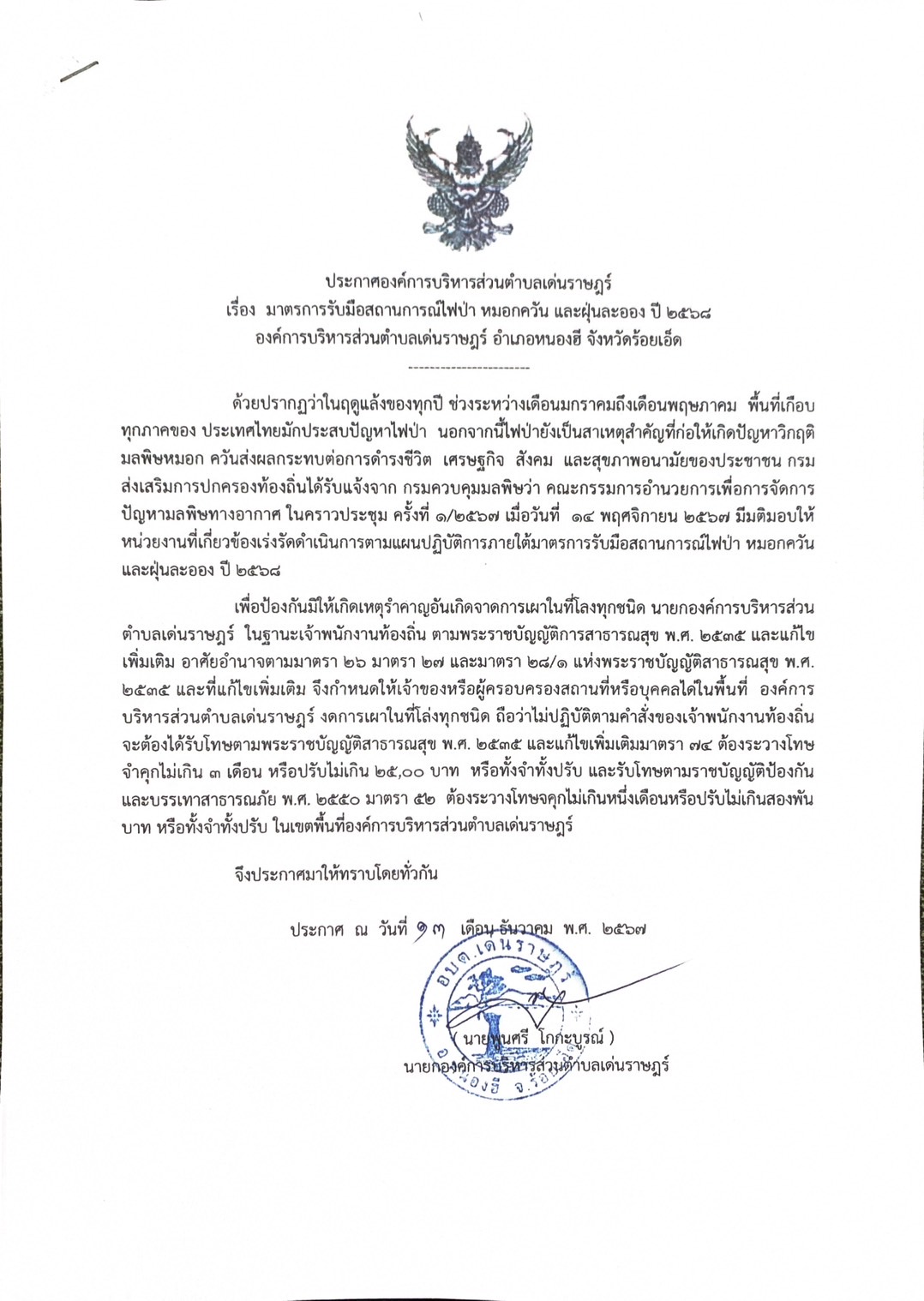 #แจ้งข่าว#ประชาสัมพันธ์ ประกาศองค์การบริหารส่วนตำบลเด่นราษฎร์ เรื่อง มาตรการรับมือสถานการณ์ไฟป่า หมอกควัน และฝุ่นละออง ปี 2568