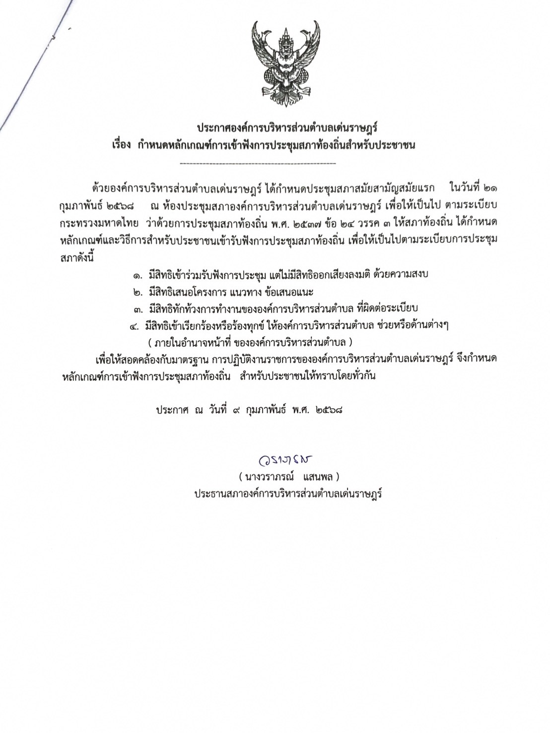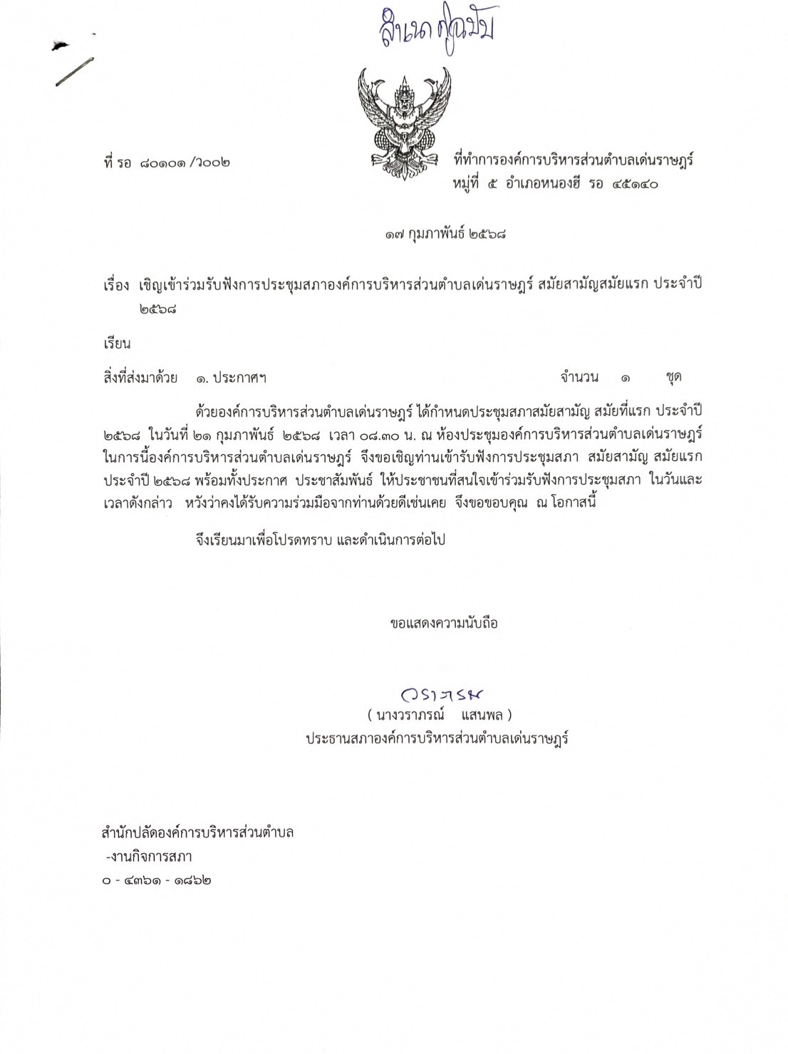 เรื่อง เชิญเข้าร่วมประชุมสภาองค์การบริหารส่วนตำบลเด่นราษฎร์ สมัยสามัญ สมัยแรก ประจำปี 2568