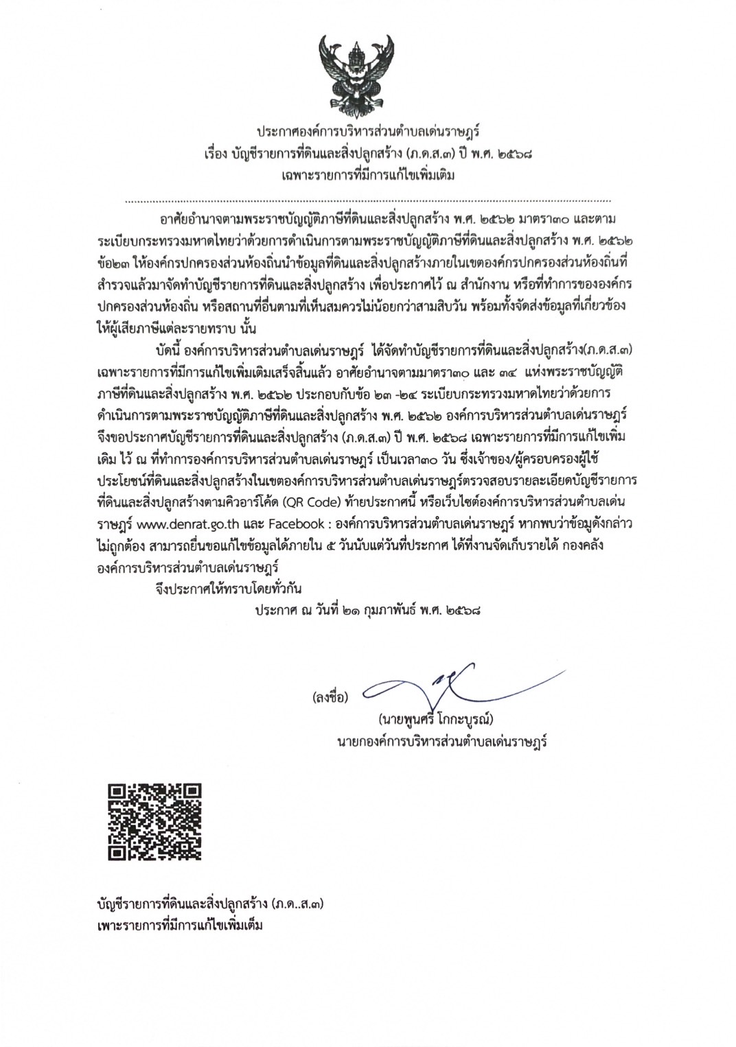 ชื่อเรื่อง : #แจ้งข่าว#ประชาสัมพันธ์!!เรื่อง บัญชีรายการที่ดินและสิ่งปลูกสร้าง (ภ.ด.ส.3) ปี พ.ศ.2568 เฉพาะรายการที่มีการแก้ไขเพิ่มเติม