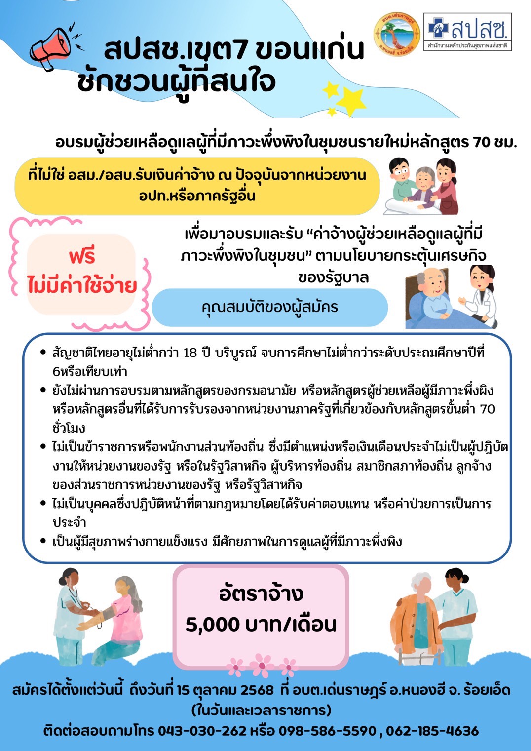 ชื่อเรื่อง : #ประชาสัมพันธ์ ผู้ที่สนใจอบรมหลักสูตรผู้ช่วยเหลือดูแลผู้ที่มีภาวะพึ่งพิงในชุมชนหลักสูตร 70 ชม. รายใหม่
