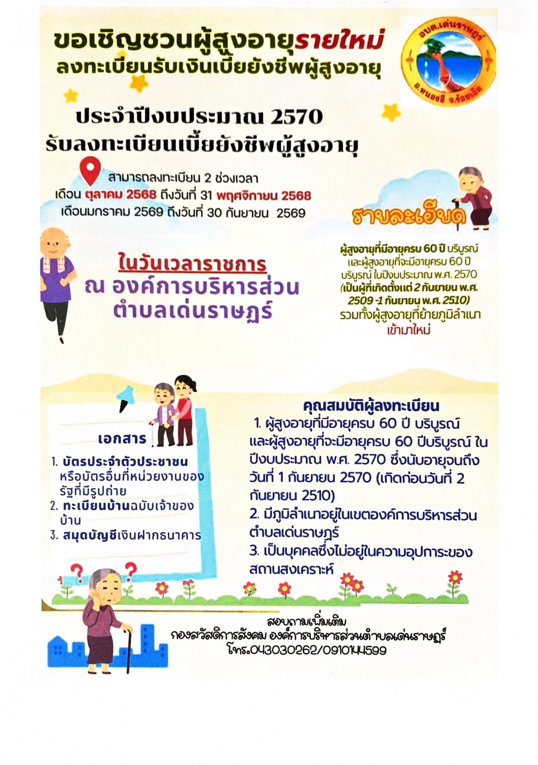 ชื่อเรื่อง : !!ประชาสัมพันธ์!! #เรื่อง ขอเชิญชวนผู้สูงอายุ(รายใหม่) ลงทะเบียนรับเงินเบี้ยยังชีพผู้สูงอายุ ประจำปีงบประมาณ 2570