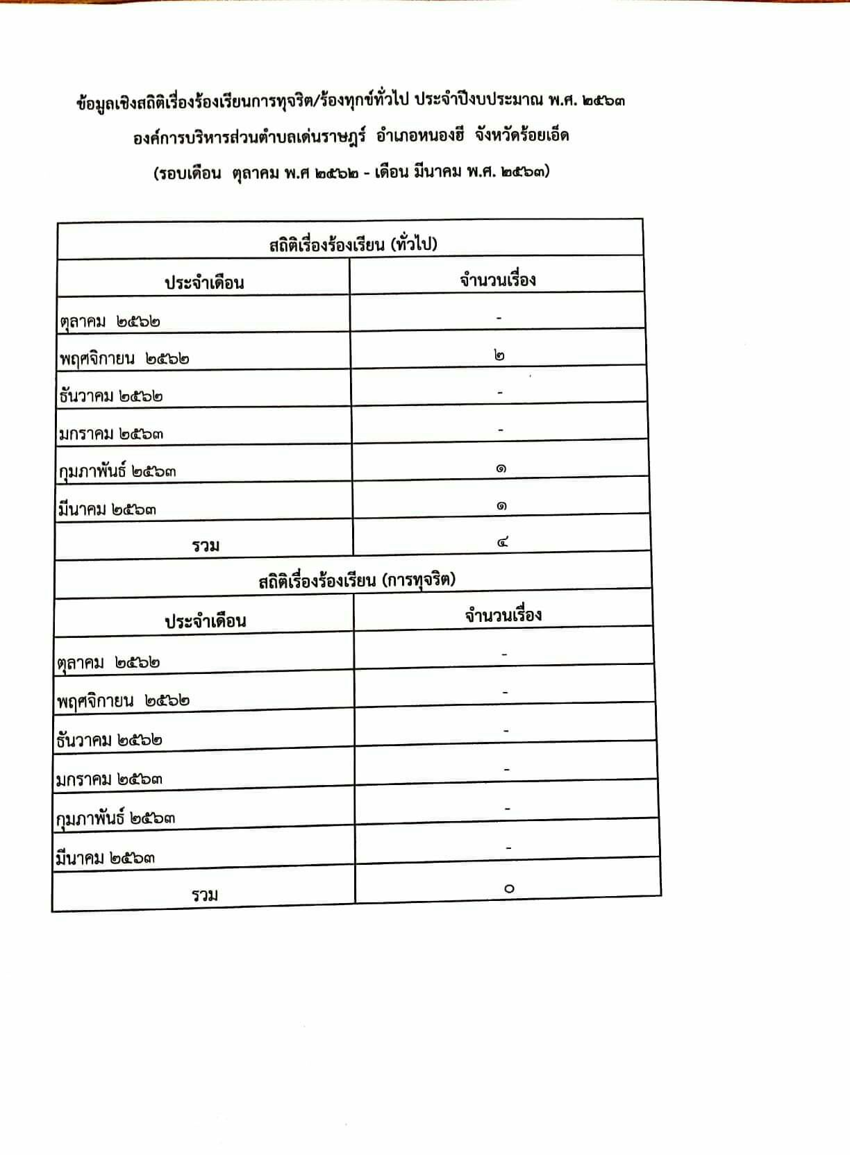 ข้อมูลเชิงสถิติเรื่องร้องเรียนการทุจริต/ร้องทุกข์ทั่วไป ประจำปีงบประมาณ พ.ศ. 2563